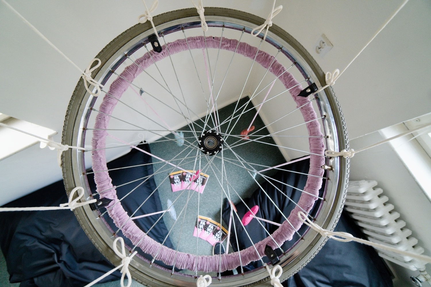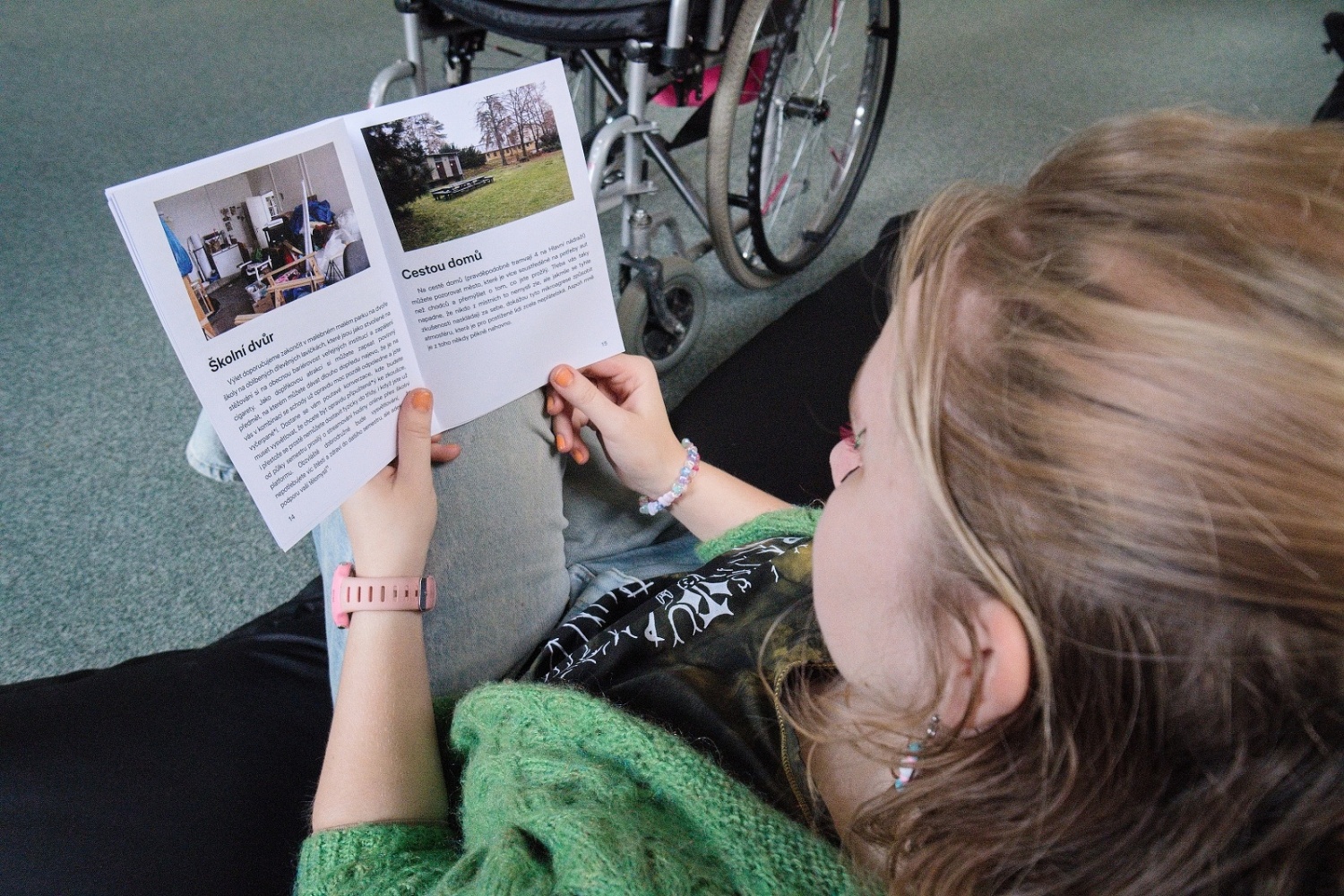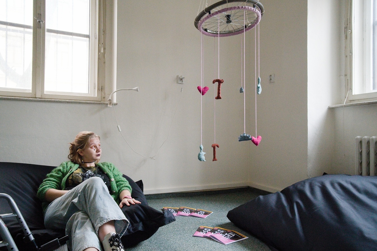 Publikace byla prezentována ve čtenářském koutku, nad kterým visel ručne dělaný kolotoč nad dětskou postýlku, který má základ v rozbitém kole od mého vozíku. Na něj jsem pověsil malé plyšáky, na kterých jsou vyšité nevědomé přesvědčení, které jsem dřív měl o životě postižených lidí, které mě držely ve víře, že se lidem s postižením žije v této společnosti obstojně. Pod kolotočem budou papírové ziny, které parodují průvodce typu Marco Polo. V nich budou moje fotky konkrétních míst a popisy ableistických mikroagresí, co jsem zde zažil.